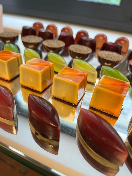 - Sortimente bean-to-bar și praline umplute cu creme naturale