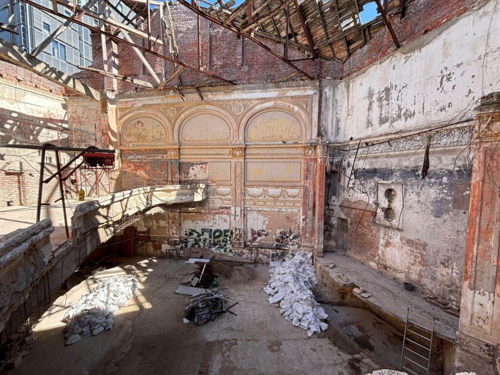 Intrând în clădire, se poate observa cum pe scena fostului cinematograf au fost deja amplasate schele, parte integrantă a proiectului de punere în siguranță. Această etapă include îndepărtarea pericolelor, recuperarea elementelor valoroase și sprijinirea plafoanelor și pereților. Este doar o mică parte dintr-un proiect de restaurare mult mai amplu, care se preconizează că va dura până în 2031.