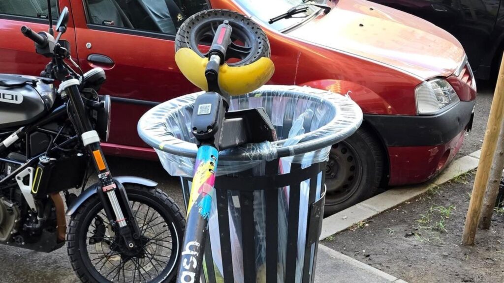 Într-un oraș în care fiecare colț de trotuar pare să fie o potențială parcare, o trotinetă electrică a reușit să își găsească un loc de parcare chiar în coșul de gunoi, demonstrând astfel creativitatea utilizatorilor săi.